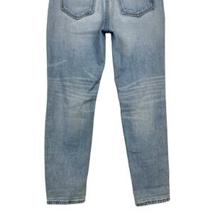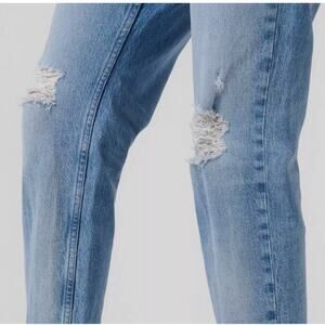 Stylish straight leg jeans. Light blue wash. Distressed details on knees. Perfect for casual wear.