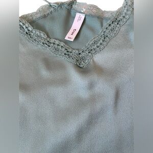 Soft lightweight fabric with delicate lace trim neckline. Simple non-adjustable straps. Flowy, flattering fit — perfect for layering or wearing alone.