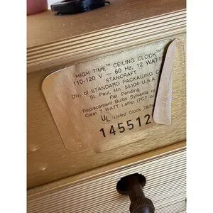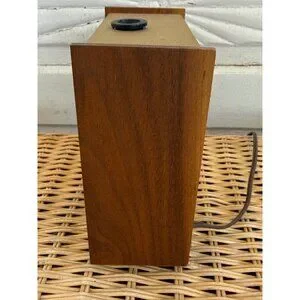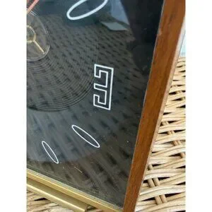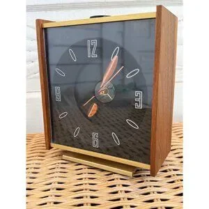 A timeless vintage 1960s Mid-Century Modern Stancraft alarm clock with a unique ceiling projection feature. Perfect for retro enthusiasts and collectors, this illuminating clock combines functionality with style, adding a touch of nostalgia to any room. This clock is working. The alarm works, it projects on the ceiling. I just replaced the bulb with a new one. The clock does lose a few minutes over a 24 hour period. This measures 6x5.5". There is a glue sticker residue on the wood on one side and is pictured. Otherwise in good shape.