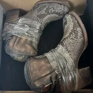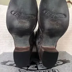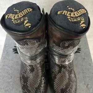 Stylish Freebird booties with a snakeskin pattern. Perfect for a bold look.