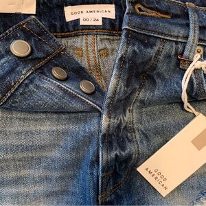 Good American bombshell distressed shorts new with tags. Super flattering, curve enhancing with flat-tummy tech and gap-proof waistband. High rise. Medium wash. Button fly closure. Small amount of stretch.