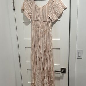 Chic blush maxi dress with stripes. Features button-down front and flutter sleeves. Perfect for any occasion. The sleeves have been professionally hemmed.