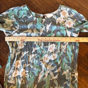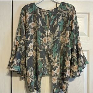 EUC. Chic floral blouse with 3/4 bell sleeves. Perfect for versatile styling. Features a stylish green and cream design. Ideal for any occasion. Size: Small.