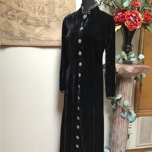 DOUBLE D RANCH Luxurious Black Velvet Dress, size large, long sleeve, features elegant button detailing with twelve silver tone buttons plus one stand-out neck button. Neckline is lined in silver tone studs as well as on the sleeves. Exceptional Designer Dress, In great and beautiful condition. See photos for measurements