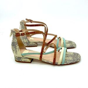 Features colorful leather straps with reptile embossing. Gold and silver hardware. Back zippers. 1 inch heel.