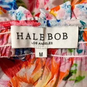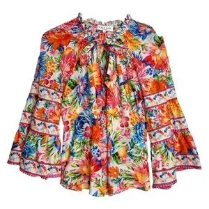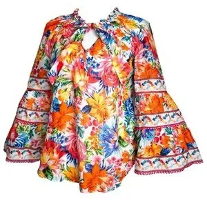 Hale Bob Top Lucinda Pink Orange Blue Floral Bell Sleeve Boho Resort Blouse M
