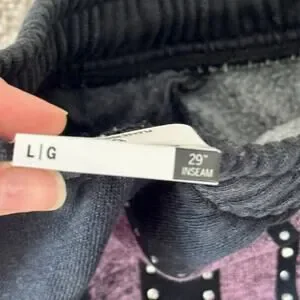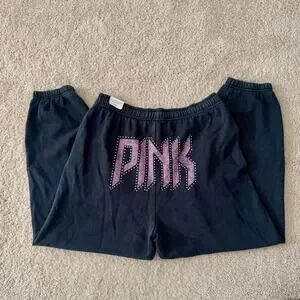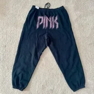 Item 1 - 2025 limited release PINK cropped Ivy fleece sweatpants. Loose fit style with 29 inch inseam. Faded black background color, faded graphic, studded detailing. Drawstring waist. sparkly! New with tags. Size large