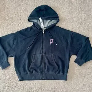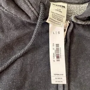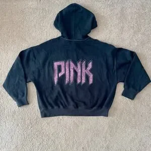 Item 2 - 2025 limited release PINK. Full zip hoodie with kangaroo pocket and drawstring hood. Faded black background color, faded graphic, studded detailing. sparkly! New with tags. Size large