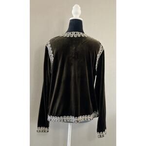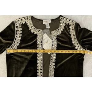 New with tags from QVC. Chocolate brown velvet jacket is from designer Victor Costa Occasions Collection. Gold and Silver embroidered trim and Faux Diamond accents.