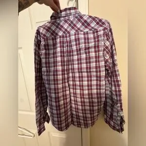 Classic plaid shirt with button-up front. Features red and blue pattern.