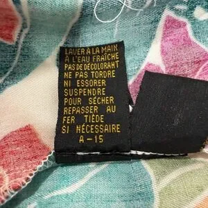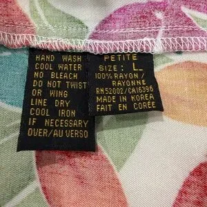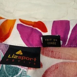 Vibrant floral fabric from LizSport. Features vibrant shades of red, orange, blue, purple, and green. It has one button down the front and three buttons on each sleeve, as well as three front pockets.