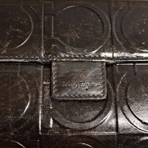 Salvatore Ferragamo compact black leather wallet. Snaps are snappy.