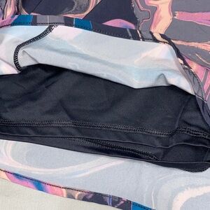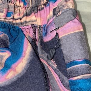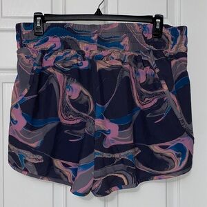 Avis XXXL women's running shorts. Features a zip pocket and under shorts. Dynamic swirl pattern with pink and blue hues. Comfortable fit for active wear. Perfect for workouts or casual outings. No holes, stains and from a smoke free home