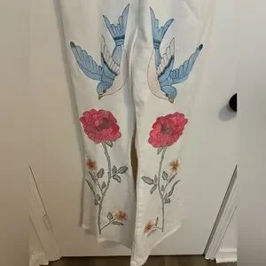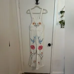 Stunning Fillyboo jumpsuit featuring intricate all-over embroidery with florals and birds for a true boho-chic statement. Crafted in crisp white twill, this piece has adjustable straps for a customizable fit, a button and zipper closure in the back, and flattering flare legs that give it an effortlessly cool, vintage-inspired silhouette. Perfect for festivals, vacations, or styled with layers year-round.