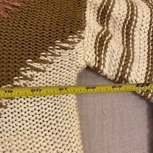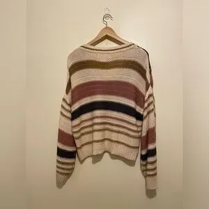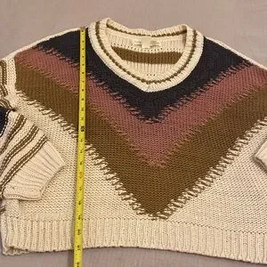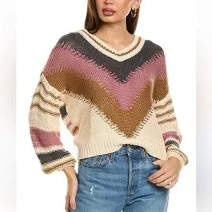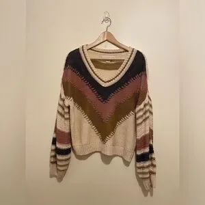 Chic V-neck sweater with chevron pattern. Features cream, pink, and brown tones. Perfect for casual wear.