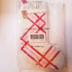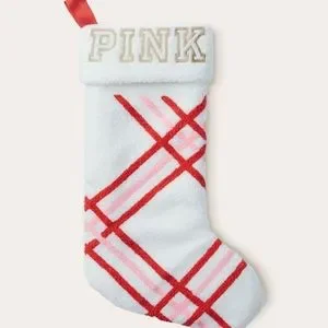 Festive holiday stocking by PINK Victoria's Secret. Features red and pink plaid design. Perfect for holiday decor.