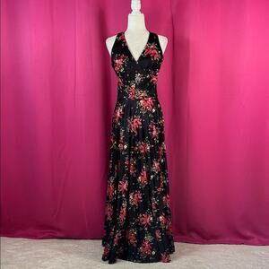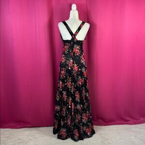 Soft satin floor length dress in a black and Red floral print with fit and flare silhouette. Fitted bodice with crossed back straps and veed neckline. Back zip closure, not much for stretch, no pockets. There are no tags, but would best fit a small from measurements.