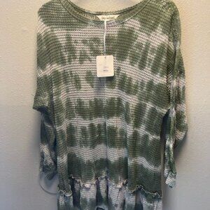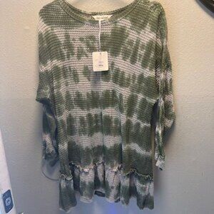 Davi & Dani Boho Chic Olive & White Tie-Dye Waffle Knit Tunic Top W/ Ruffle Hem