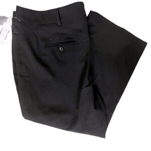 Double bar & slide closure with inner button. Zip fly. Two front pockets. Two back pockets. Belt loops. 60% polyester, 35% rayon, 5% spandex. Machine wash.
