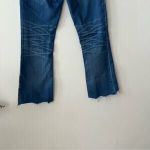 In good preowned condition. Medium blue wash with flattering whiskering. Cool, raw chewed hems.