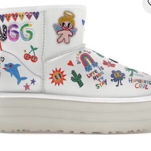 Colorful UGG ankle boots with unique graphics. Features playful characters and symbols. Perfect for a bold look.