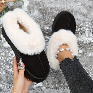 Black Casual Women's Thick Flat Suede Shearling Slippers