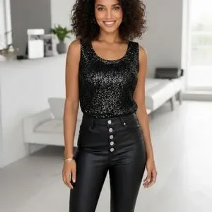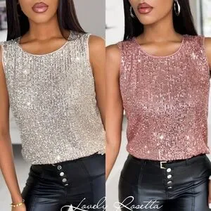 Shine bright with this stunning champagne sequin sleeveless top. Perfect for a night out or special occasion.