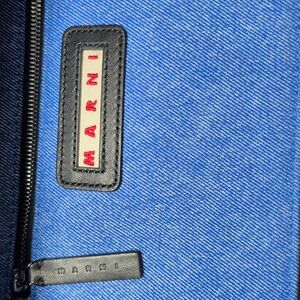 Chic Marni tote in blue denim. Features bold white lettering. Ideal for daily use.