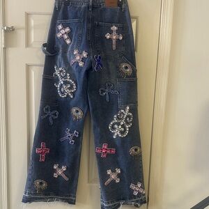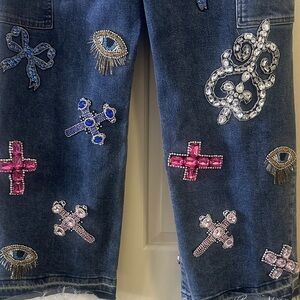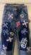 Blue denim jeans with pink and blue embroidery. Flare and wide leg style. Eye-catching design.