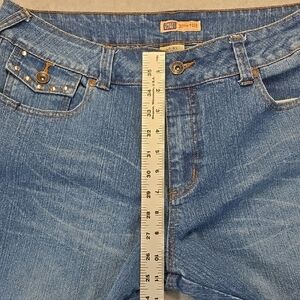 Stylish Faded Glory stretch denim jeans featuring a flattering cropped/capri length and eye-catching floral embellishment with studs on the leg.