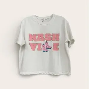Chic womens tee with bold pink raised Nashville and boots graphic. Soft and comfy for daily wear.