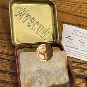Besame Brown 1920 Cake Mascara with box, tin, instructions, and applicator. I think the mascara melted a little at some point, as there is some on the tin and discoloration on the box. Lightly used otherwise. This is the old formula.
