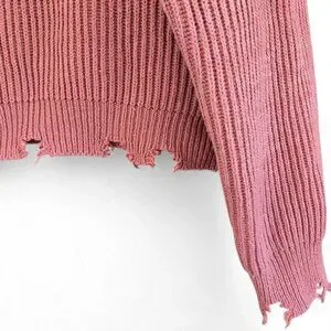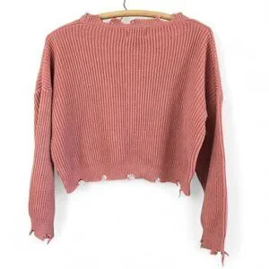 cropped sweater, distressed knit, pink sweater, ribbed pullover, casual top, womens knitwear, layering piece, textured jumper, soft sweater, relaxed fit, poof apparel