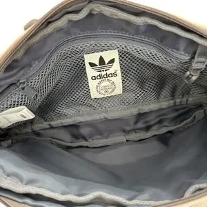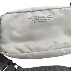 Adidas Originals utility-style waist bag in a versatile light gray color. Designed with multiple zip compartments, a mesh interior pocket, and an adjustable strap for wear as a waist pack or crossbody sling. Features signature Trefoil branding and "The Brand With the 3 Stripes" detailing. Ideal for everyday use, travel, festivals, streetwear outfits, and hands-free errands.