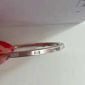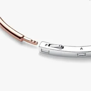 Make minimal stacking your mantra with the Pandora Signature Two-tone I-D Pavé Bangle. The minimalist bracelet is crafted from two metal finishes; sterling silver and a 14k rose gold-plated unique metal blend. The band's profile transitions from square to round; the squared half features evenly spaced sparkling baguette stones, while the rounded part is warm-toned. The engraved logo on the side corresponds with the placement of the baguette stones. The unique hinge and click closure clasp make it easy to wear and remove this Pandora bangle bracelet. Wear alone as your signature piece, or stack multiple bracelets for a bold look.