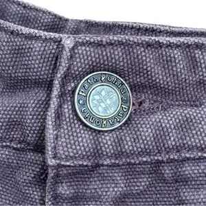 Rare vintage Patagonia women's denim 100% cotton utility shorts in a rich purple plum color. These late-1990s era shorts feature a structured design with durable construction, classic Patagonia hardware, and a casual/workwear silhouette. Made in Indonesia and finished with the iconic Patagonia logo patch at the back waist. Exceptional example of Patagonia's vintage lifestyle line.