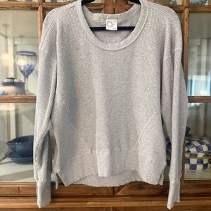 Soft neutral waffle knit pullover with relaxed oversized sleeves and thumbholes. Perfect everyday lounge layer.