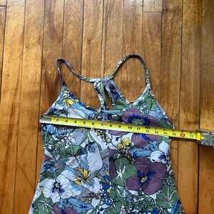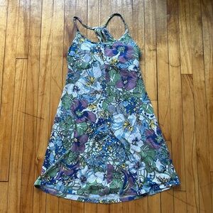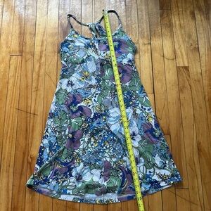 Patagonia Women's Spright Dress Floral Green Blue Purple White Keyhole Back L. Approx measurements: 15” pit to pit, 36” length. Materials: 55% organic cotton, 45% Tencel lyocell. Built in bra. In excellent used condition. Offers welcome!