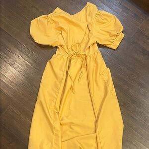 Stylish yellow midi dress with puff sleeves and button-down front. Features two front pockets. Very light weight