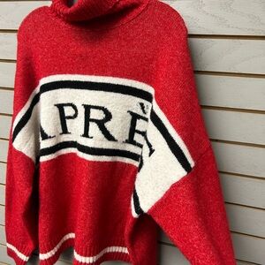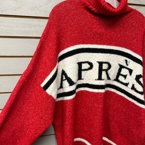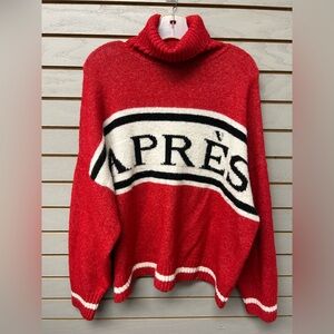 Bold red turtleneck with Après design. Cozy and stylish for cool weather.