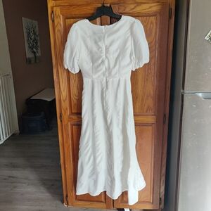 Whimsical white midi dress. Features short puff sleeves and v-neckline. Perfect for any occasion.