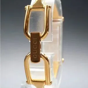 Stylish Gucci watch with a gold band. Features an iridescent rectangular dial. Ideal for elegant wear. Bought it on ebay but its too big for my wrist. Shows signs of wear as expected for a vintage watch. No discoloration