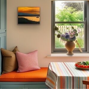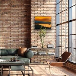 Experience tranquility with this stunning sunset over water canvas art. The vibrant orange and yellow hues create a warm and inviting atmosphere. Perfect for adding a touch of nature to your home decor.