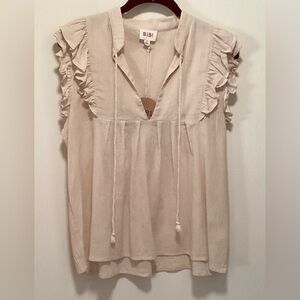 Chic cream blouse with ruffle sleeves. Features a V-neck and tie detail. Great for layering.