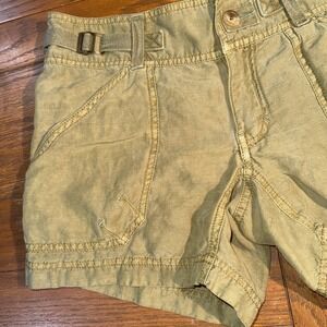 The Free People Women's Olive Green Shorts in Size 2 feature a stylish adjustable belt and are made from a luxurious blend of silk and linen. With a solid pattern and button closure, these shorts are perfect for travel, activewear, or casual outings. The low rise and regular fit ensure comfort and a flattering silhouette, while the 4-inch inseam adds a trendy touch to the classic utility style. Machine washable and adorned with buttons, buckles, and zippers, these shorts are a versatile and fashionable addition to any woman's wardrobe. Smoke free home. EUC.
