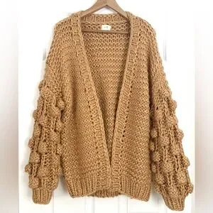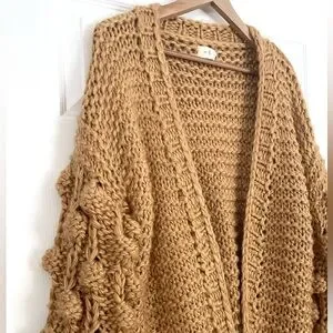 Chunky knit open cardigan with bubble sleeves. Honey mustard color. Soft feel.