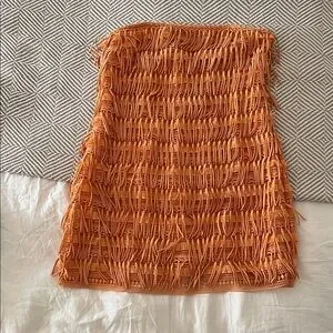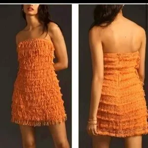 Vibrant orange mini dress. Features intricate fringe detailing. Perfect for a bold statement.