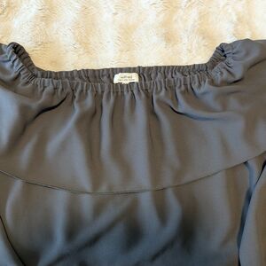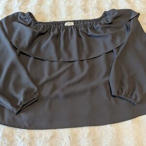 Wilfred Morel Blouse from Aritzia. It is an off-the-shoulder top featuring a prominent ruffled neckline and long sleeves with elasticized cuffs.