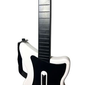 This Guitar Hero wireless controller is for PlayStation 2 (PS2). The controller features the classic five-button fret layout, strum bar, and whammy bar, and comes in the white body with black neck design shown. A shoulder strap is included.