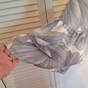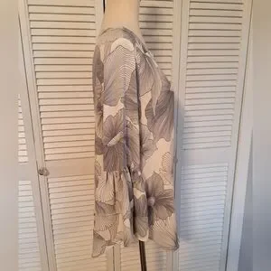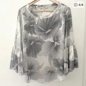 Elegant women's top featuring a beautiful floral design with ruffle 3/4 bell sleeves. Perfect for adding a touch of sophistication to any outfit. size is medium. armpit to armpit is 21", shoulder to hem is 27". excellent condition
